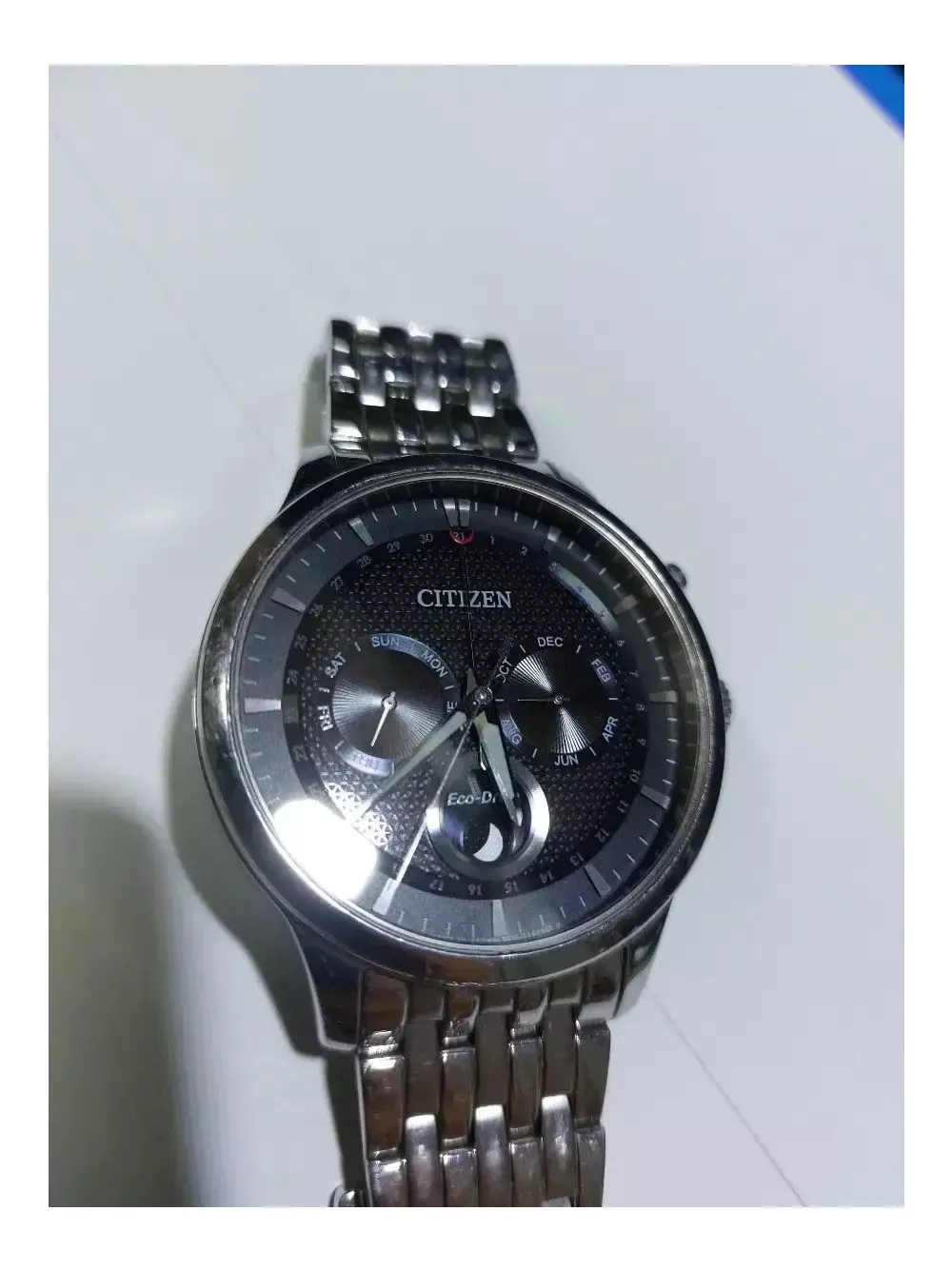시티즌 문페이즈 검판 에코드라이브 모든 빛으로 충전됩니다. 밴드길이 대략 17.5~18cm정도. 유리 깨끗함. 밴드 생활기스있음. 시계단품. 작동 정상.