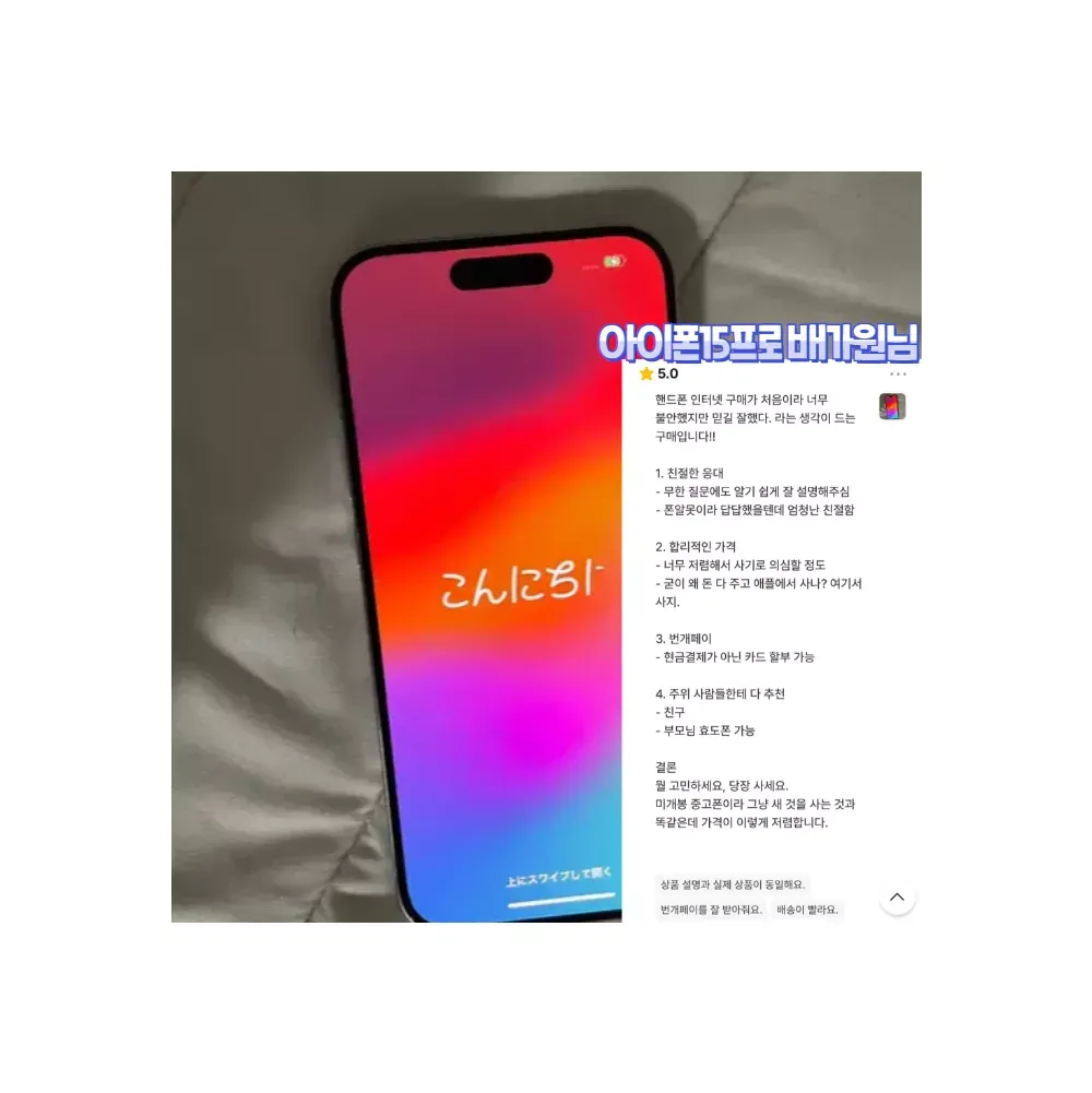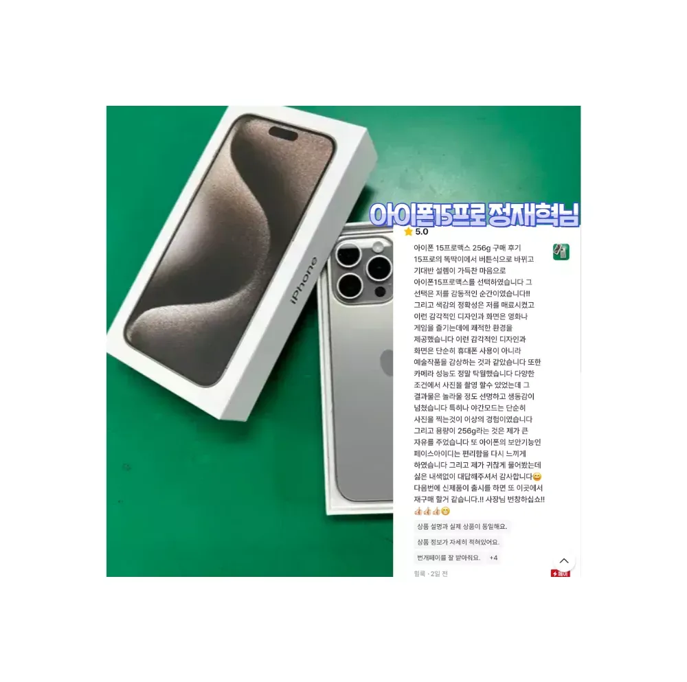 번개장터는 상점주인이 직접 후기를 삭제하거나 수정할수 없게 되어 있습니다 네*버/쿠*/옥* 처럼 후기를 조작했거나 거짓후기 일 시 자진 상점삭제 하겠습니다. ✔️번개장터 미개봉새상품 전문 프로상점 ✔️상점 팔로워 1만명 인증상점 ✔️상점 방문수 27만명 인증상점 ✔️번개페이 거래내역 999건+ 인증상점 ✔️상점평점 5점만점 후기 999건+ 인증상점 ?핫딜 이벤트 가격표? • 아이폰15+ -> "17만원" • 아이폰15 -> 상점 내 특가판매 • 아이폰15프로 -> 상점 내 특가판매 • 아이폰15프로맥스 -> 상점 내 특가판매 ♦️이벤트상품으로 재고소진 시 판매종료 됩니다. ?본 상점의 모든제품은 사용이력이 없는 미개봉새상품 입니다. ?모든상품 번개페이 안전결제 가능합니다. ?상품구매 후 1년 간 삼성/애플 공식 서비스센터에서 무상 보증서비스 가능합니다. ?구매순서는 번개톡문의 > 주문접수하기 > 재고확인 > 결제진행 > 택배발송 입니다. ?택배사는 CJ,로젠,우체국 택배사 이용 중 이며, 모든상품 무료배송 입니다. ?주문확정 시 1~3일 내 택배수령 가능하며, 서울/경기권 퀵서비스(고객부담) 가능합니다. ?리뷰작성 시 프리미엄 사은품6종SET (크리스탈케이스3개/크리스탈필름3개/젠더/케이블/휴대폰거치대/그립톡) 증정합니다. ?리뷰작성 시 매월 추첨 10명 에어팟프로 or 버즈프로 증정합니다. ?상담시간은 평일 오전10시~오후8시 이며, 주말은 휴무입니다. 상담량이 많아 답변이 늦더라도 양해 부탁드립니다. ?구매조건에 따라 금액이 변동될 수 있으니, 번개톡으로 1:1 문의 주시면 할인조건에 대해 설명드립니다. ?온라인 구매가 처음이라 구매 망설여지신다면, 실제 저희 고객님들 상점후기 확인해보시고 참고해보시면 좋습니다. ?번개장터 최상위(신용도 상위1%) 모범상점입니다. 안심하고 구매하세요♡ #특가 #선착순 #재고소진시 #이벤트종료 -할인안내 출고가 (1,342,000원) - 공시지원금 (500,000원) - 추가지원금 (75,000원) - 라이트제휴할인 (597,000원) = "판매가 170,000원" -사전승낙서 https://www.ictmarket.or.kr:8443/ajax/ajax3.do?id=PRE0000155098&seq=1&yn=1