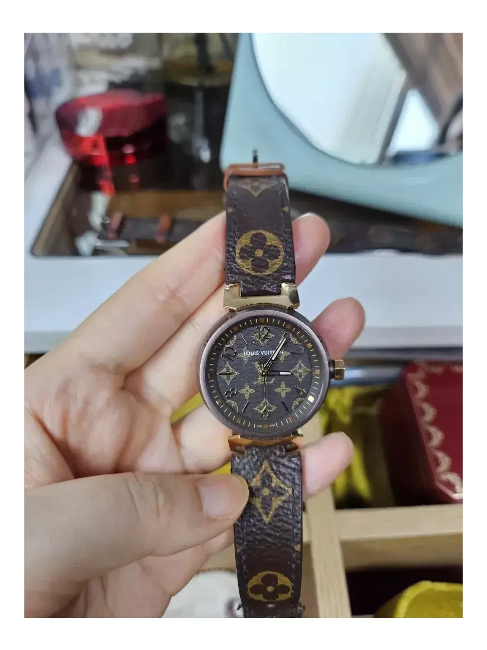 서울 롯데백화점 애비뉴엘 본점에서 작년 구매. 풀박스로 다 있습니다.한개당 830 주고 구매. 지금은 더 오른것으로 알고있습니다. 루이비통 땅부르 모노그램 남성시계는 팔렸고, 여성시계 남았습니다. 28mm. 스트랩줄 교체 감안해서 저렴하게 올려요.(에눌불가) 사진을 넘겨보시고 생각하세요. 100m까지는 방수기능있고, 주변 폴리싱 처리는 18k로 되있어서 세련되었습니다. 꼭 아시는분이 가져가주세요. 안팔리면 그냥 착용할거에요~~ 그리고 번개장터와 당근마켓에만 판매를 하고있음. 그외 타사이트는 도용입니다. 현저히 낮은가격 의심하세요 여러분. 반품,교환,환불 불가.신중히 챗주세요! 직거래만 합니다?