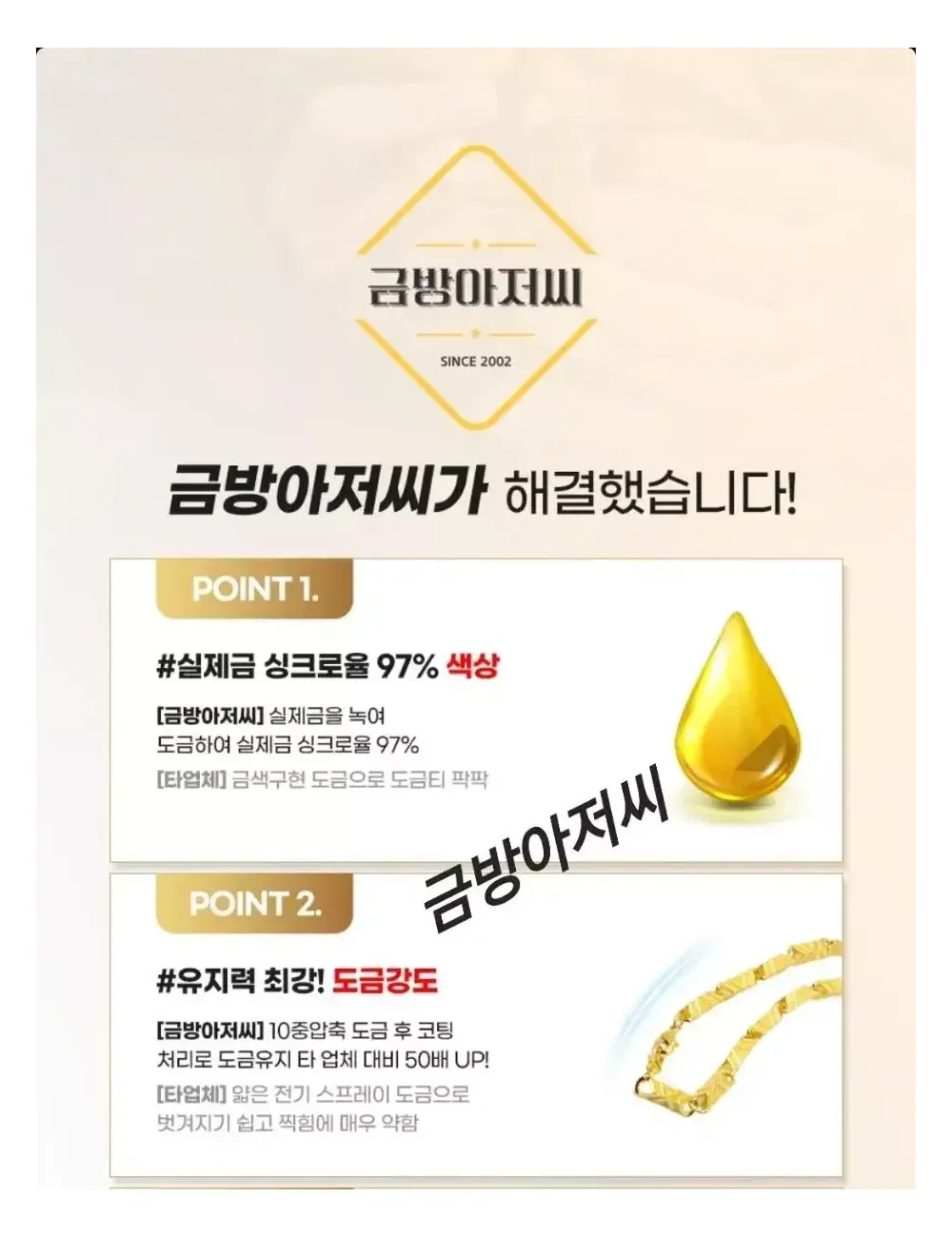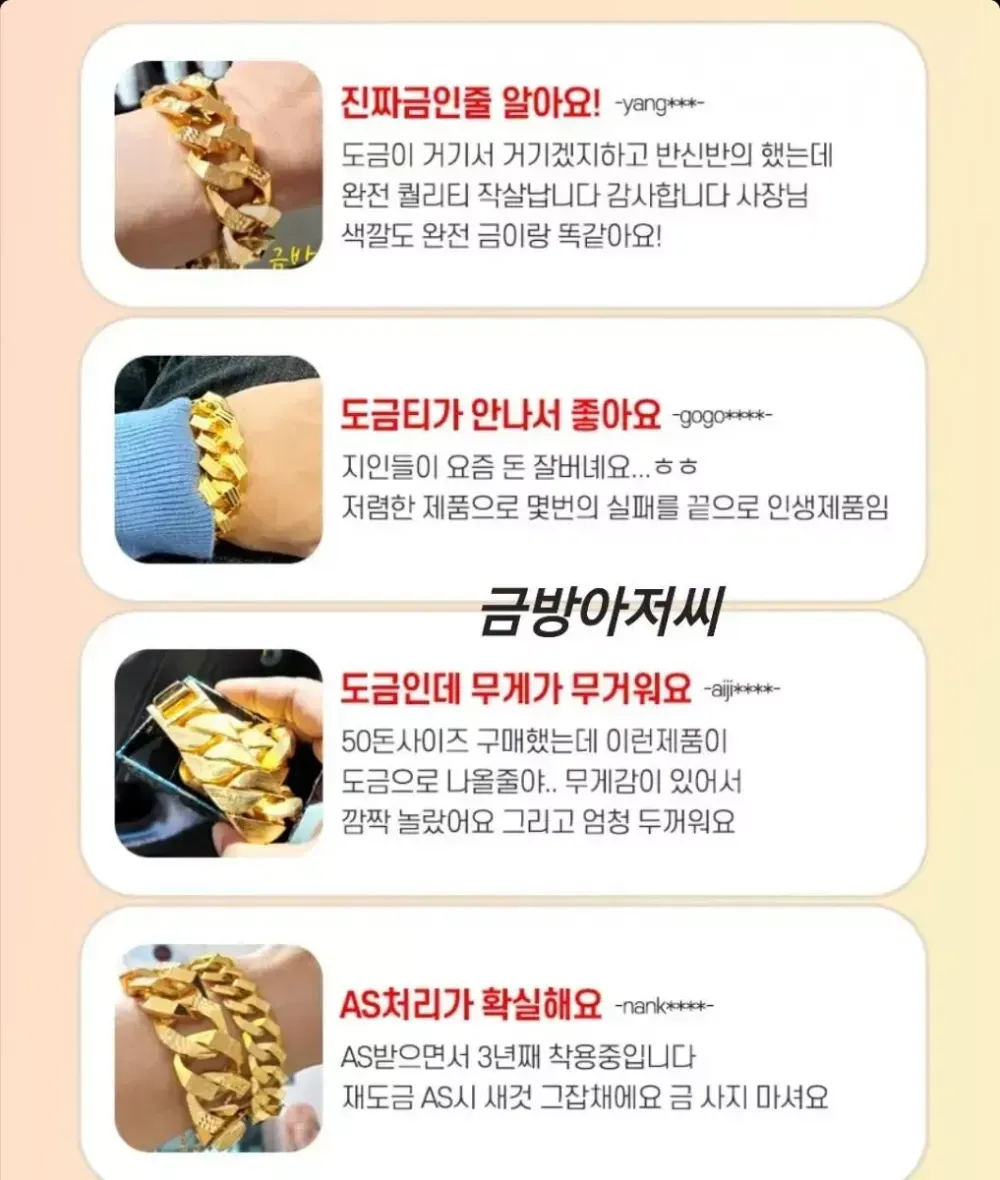 두께6MM 다이아보카시 대나무 목걸이 실중량 20돈무게 50센치 135,000원 55센치 145,000원 60센치 155,000원 선택옵션 18k750 & 24k999 각인추가 색감추가 각각 만원씩 추가 가능하십니다~^^ ?NEW 드디어 번개장터 입점!? 100%실제금 10중 압축도금 -20년경력 실제 금은방 세공 장인이 직접 제작하는 도금 ?국.내.최.초? -실제 금도금 & 금은방 디자인 길이 맞춤제작- -금방아저씨의 다양한 상품을 구경하세요- (링크) ❗️❗️이런적 있지 않으신가요❗️❗️ 1.시중에 파는 저가의 도금 구매후 1주일만에 버리셨다구요? 2.주변사람들에게 도금인걸 들킬까 두려우셨나요? 3.알러지가 생기셨나요? 4.사용한지 1주일도 안돼서 벗겨지셨나요? 5.금은방에서 나오는 디자인을 찾고 계신가요? 6.두꺼운 금팔찌, 금목걸이 차고 싶은데 가격이 너무 부담이라구요? ✅️금방아저씨가 해결했습니다✅️ 1.실제금 싱크로율 97% 색감 2.유지력 최강 도금강도/ 저가 동대문제품 비교불가 3.특수소재 신주 사용으로 묵직한 무게감 4.특수제작 코팅 알레르기 ZERO 5. 착용 후 변색이 되어도 평생 재도금AS 새 것 처럼 복구 6. 맞춤제작 다양한 사이즈! ------------------------------------ 선택 옵션 18k750 & 24k999 각인추가 순금색감추가 ( 추가 없을 시 기본 18k도금으로 제작!) 각각 만원씩 추가 가능! ------------------------------------ 교환/빈픔 안내 1. 주문즉시제작 제품이기 때문에 단숨 변심 교환 및 환불 불가능 합니다 신중한 구매 부탁드립니다 2. 잔기스, 들뜸현상 순금도 다 있습니다 잔기스, 미세한 오차 이런 부분은 하자가 아니니 반품 불가능합니다 3. 착용 시 알레르기 반응으로 환불 불가능합니다 실제 은 알러지, 금알러지가 있다고 하시면 해당 제품 구매 권장하지 않습니다. 1000명 중 1명 알러지 반응은 알러지 제품이라고 보기 어렵습니다. 4. 사이즈가 크거나 작으 실 경우 유상 AS요청 해주시면 다시 제작해서 보내드립니다 이에 동의 하실경우 구매 부탁드립니다