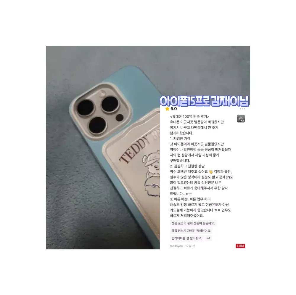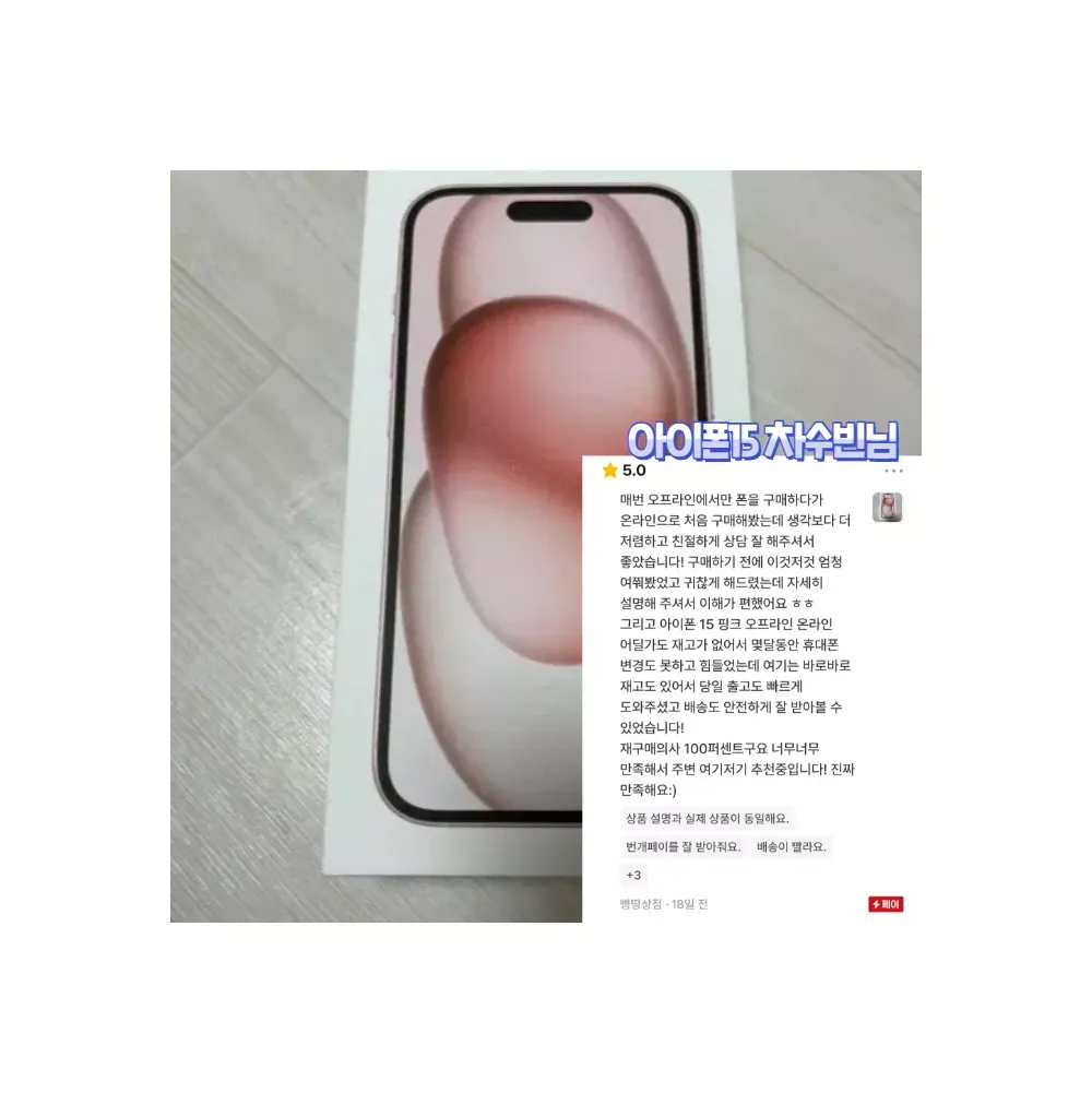 번개장터는 상점주인이 직접 후기를 삭제하거나 수정할수 없게 되어 있습니다 네*버/쿠*/옥* 처럼 후기를 조작했거나 거짓후기 일 시 자진 상점삭제 하겠습니다. ✔️번개장터 미개봉새상품 전문 프로상점 ✔️상점 팔로워 1만명 인증상점 ✔️상점 방문수 27만명 인증상점 ✔️번개페이 거래내역 999건+ 인증상점 ✔️상점평점 5점만점 후기 999건+ 인증상점 ?핫딜 이벤트 가격표? • 아이폰15+ -> "17만원" • 아이폰15 -> 상점 내 특가판매 • 아이폰15프로 -> 상점 내 특가판매 • 아이폰15프로맥스 -> 상점 내 특가판매 ♦️이벤트상품으로 재고소진 시 판매종료 됩니다. ?본 상점의 모든제품은 사용이력이 없는 미개봉새상품 입니다. ?모든상품 번개페이 안전결제 가능합니다. ?상품구매 후 1년 간 삼성/애플 공식 서비스센터에서 무상 보증서비스 가능합니다. ?구매순서는 번개톡문의 > 주문접수하기 > 재고확인 > 결제진행 > 택배발송 입니다. ?택배사는 CJ,로젠,우체국 택배사 이용 중 이며, 모든상품 무료배송 입니다. ?주문확정 시 1~3일 내 택배수령 가능하며, 서울/경기권 퀵서비스(고객부담) 가능합니다. ?리뷰작성 시 프리미엄 사은품6종SET (크리스탈케이스3개/크리스탈필름3개/젠더/케이블/휴대폰거치대/그립톡) 증정합니다. ?리뷰작성 시 매월 추첨 10명 에어팟프로 or 버즈프로 증정합니다. ?상담시간은 평일 오전10시~오후8시 이며, 주말은 휴무입니다. 상담량이 많아 답변이 늦더라도 양해 부탁드립니다. ?구매조건에 따라 금액이 변동될 수 있으니, 번개톡으로 1:1 문의 주시면 할인조건에 대해 설명드립니다. ?온라인 구매가 처음이라 구매 망설여지신다면, 실제 저희 고객님들 상점후기 확인해보시고 참고해보시면 좋습니다. ?번개장터 최상위(신용도 상위1%) 모범상점입니다. 안심하고 구매하세요♡ #특가 #선착순 #재고소진시 #이벤트종료 -할인안내 출고가 (1,342,000원) - 공시지원금 (500,000원) - 추가지원금 (75,000원) - 라이트제휴할인 (597,000원) = "판매가 170,000원" -사전승낙서 https://www.ictmarket.or.kr:8443/ajax/ajax3.do?id=PRE0000155098&seq=1&yn=1