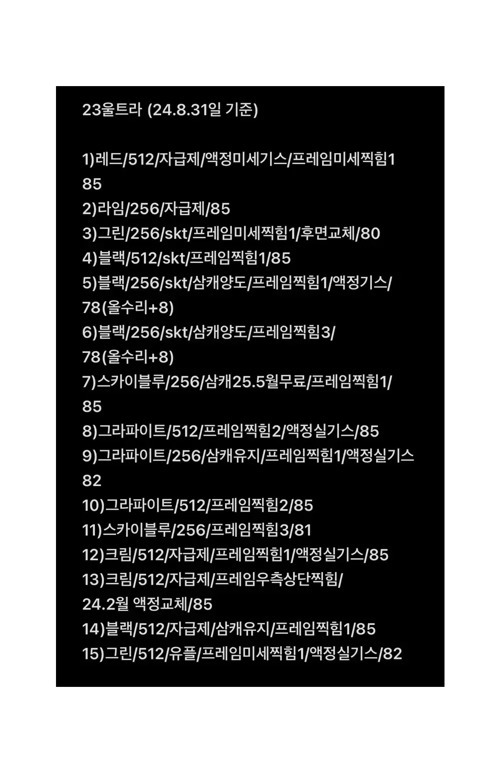 안녕하세요. 제 판매글 보시면 아시겠지만 울트라 대여 전문 프로 상점입니다. ? 울트라 대여 문의 내용은 링크 참고 ⬇️ https://link.bgzt.in/RHRS ? 판매 가격 사진 참조(24.8월 기준 작성) 가격 조율 가능 22/23/24울트라 업데이트 완료 ? 제가 판매하는 모든 울트라 기기들은 수령후 단순변심 포함 묻지마 환불 가능합니다.(파손이 없을 경우만 해당이 되고 울트라 대여비 받습니다.) ?판매 완료는 따로 고지하겠습니다. 이번 24울트라 구매 예정으로 기존 22, 23울트라 부분 정리 합니다. 모든 색상(스카이 블루, 그라파이트, 라임, 레드, 그린, 크림, 블랙, 라벤더, 스타벅스 에디션(크림), 버건디, 화이트), 용량은 256/ 512기가/ 1테라 가능하고 자급제, 통신사, 삼캐플 유무 다양합니다. 원하시는 모델과 가격대 문의 주시면 가능한 기기 사진 및 정보 드리겠습니다. 우선 다른 중고기기 대비 장점은 대여용(공연 촬영용)으로만 한달 평균 5일이하 사용으로 배터리 상태 매우 좋습니다. 하단바 없이 사용했고 항상 다크모드로 사용 대여일 제외 전원 오프후 보관만 해서 잔상이 없습니다. 기기 많습니다. 모든 기기를 판매하지는 않겠지만 문의 주시면 최대한 합리적인 가격에 가능한 기기로 추천해 드리겠습니다. 24울트라 사진 확인/ 1, 4, 5번 판매완료 23울트라 사진 확인/ 14번 판매완료 22울트라 사진 확인/ 4번 판매완료 ☑️ 기기 가격은 자급제/통신사용, 삼캐플 유무, 최초통화일 기준, 색상(삼성 단독컬러), 박스유무 차이로 판매가 조정이 있을수 있습니다. 구매 안하셔도 되고 부담없이 문의 주세요. 당근에도 글 올릴 예정이라서 문의가 많거나 해당 기기가 대여중일 경우 요청하신 기기 사진과 답변이 늦을수도 있습니다.